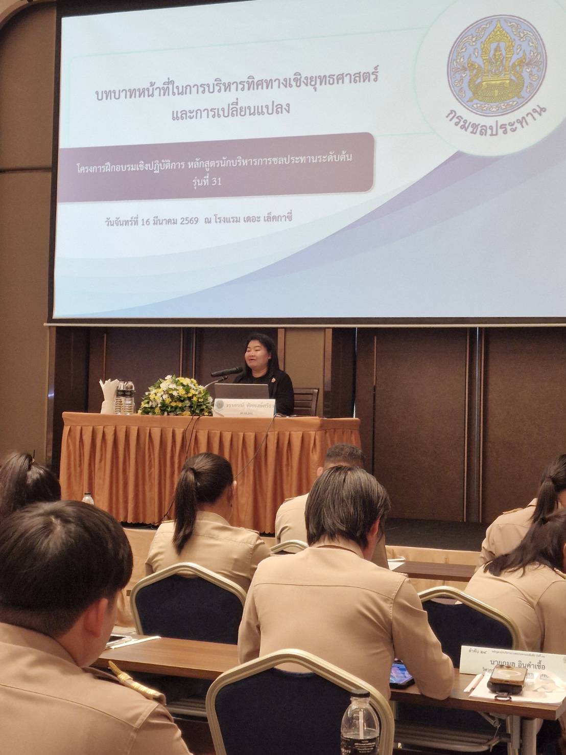 เวลา 09.00 -12.00 น. นางสาววราภรณ์ ทัตพงษ์ศรีธร ผวน.ผง. เป็นวิทยากรบรรยายโครงการฝึกอบรมเชิงปฏิบัติการ หลักสูตรนักบริหารการชลประทานระดับต้น รุ่นที่ 31 ในหัวข้อ นโยบายและแนวทางการขับเคลื่อนยุทธศาสตร์ กรมชลประทาน ณ โรงแรม เดอะ เล็คกาซี อำเภอเมืองนนทบุรี จังหวัดนนทบุรี